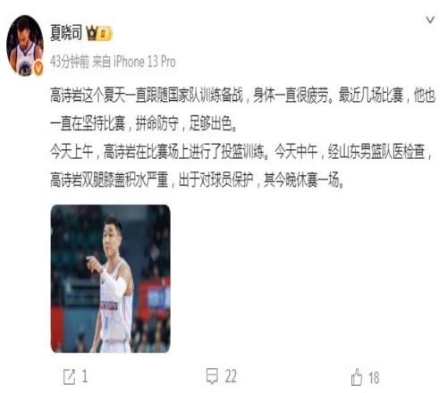 “今天上午,高诗岩在比赛场上进行投篮训练。今天中午,经山东男篮队医检查,高诗岩双腿膝盖积水严重,出于对球员保护,其今晚休赛一场。”