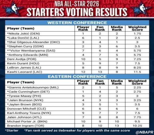 约基奇凭借球员投票西部第一,球迷投票和媒体投票都是西部第二,总分1.75分排名西部第一。东契奇球员投票西部第六,球迷投票西部第一,媒体投票西部第二,总分2.5分排名西部第二。亚历山大球员投票西部第三,球迷投票西部第四,媒体投票西部第一,总分3.0分排名西部第三。